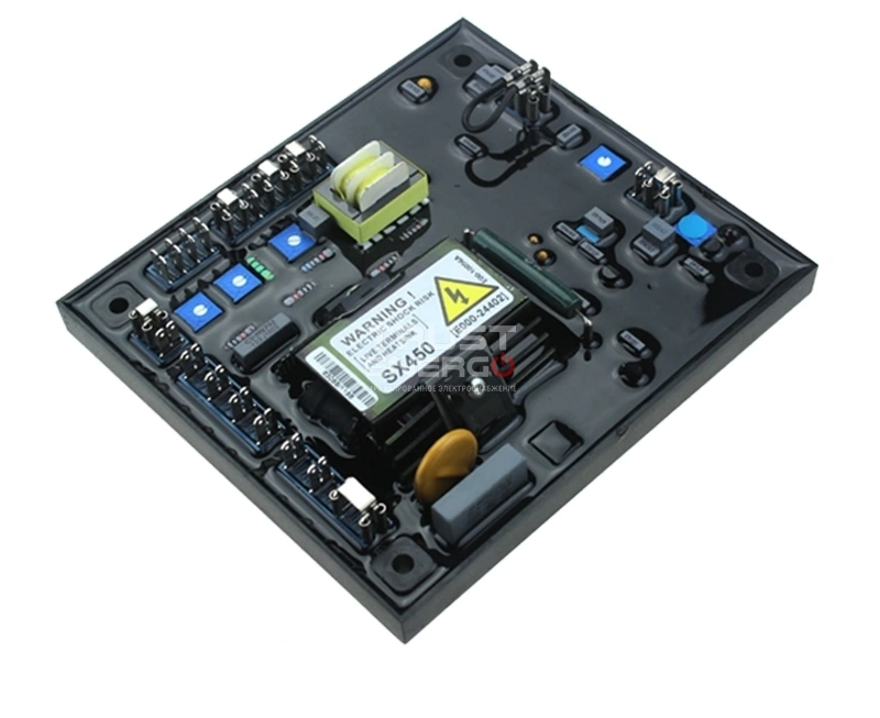 В предложении используется технология поверхностного монтажа (SMT) для высокой интеграции функций в мельчайший след AVR. Положительное накопление напряжения от остаточных уровней обеспечивается использованием опытных полупроводников в силовой схеме АВР. Цепи управления и измерения напряжения имеют отдельные клеммы, что позволяет получать мощность возбуждения непосредственно от обмотки статора для необходимых применений или от вспомогательной обмотки, если требуется устойчивая работа короткого замыкания. Который связан с основными обмотками статора и обмотками возбуждающего поля, чтобы обеспечить замкнутый контур управления выходным напряжением с регулировкой нагрузки +/- 1%, что добавило большую номинальную мощность, основанную на SX440.